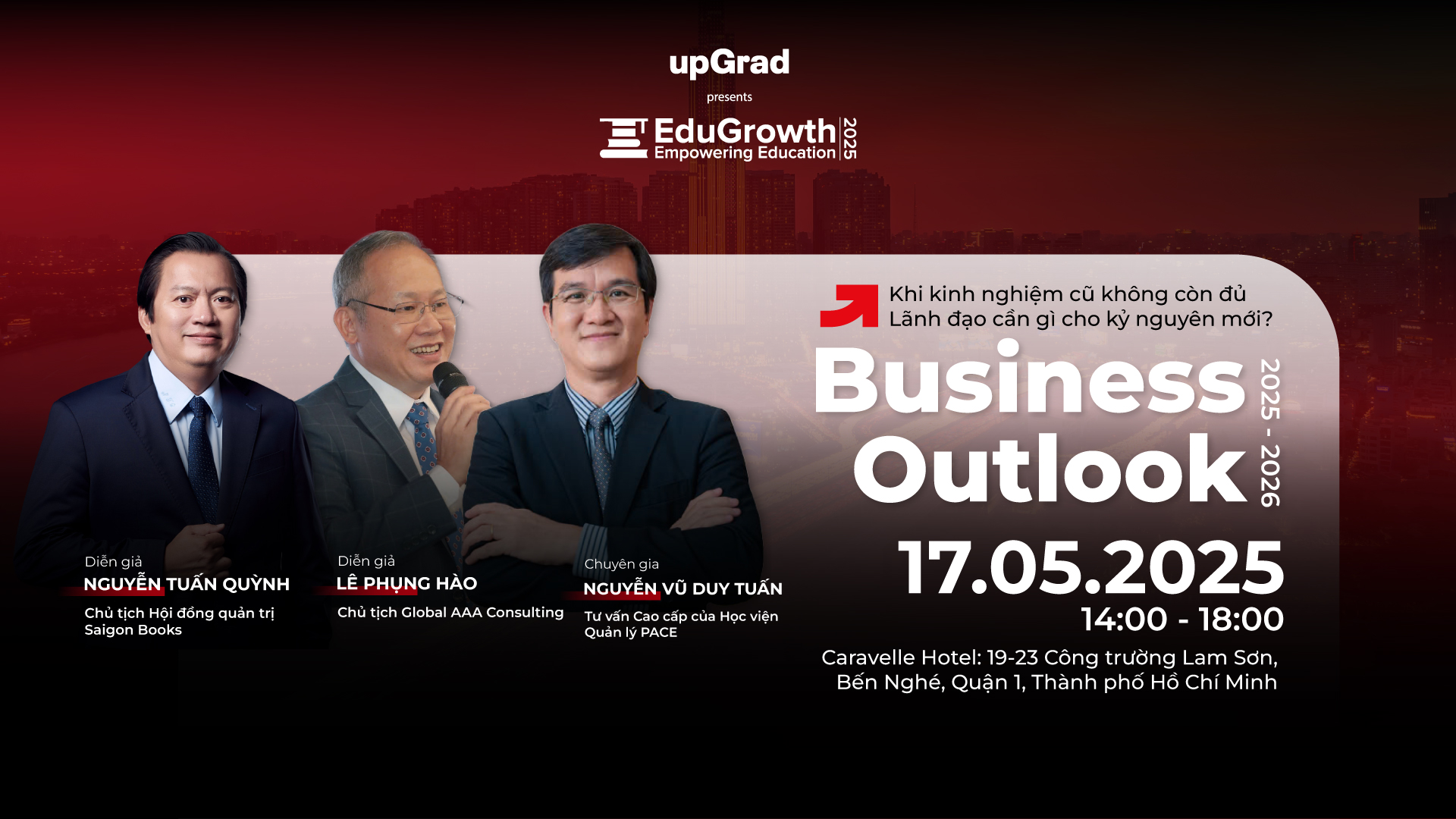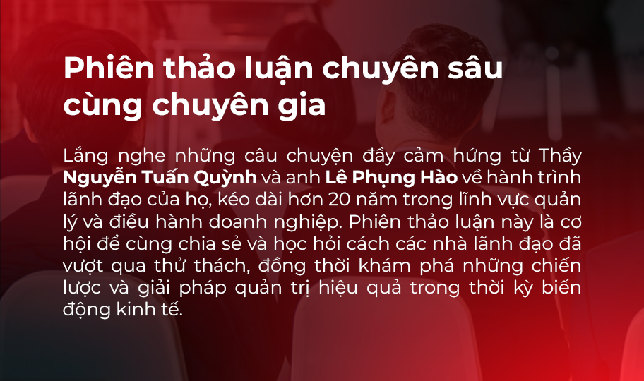 Tham gia sự kiện cùng thầy Nguyễn Tuấn Quỳnh, anh Lê Phụng Hào và chuyên gia Nguyễn Vũ Duy Tuấn để cùng lắng nghe và học hỏi cách các nhà lãnh đạo hơn 20 năm kinh nghiệm đã vượt qua thử thách trong doanh nghiệp, đồng thời tìm kiếm những giải pháp và chiến lược quản trị hiệu quả cho tương lai.