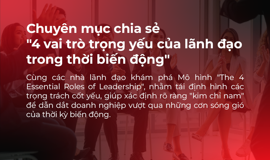 Cùng lắng nghe Chuyên gia Nguyễn Vũ Duy Tuấn chia sẻ về mô hình “The 4 Essential Roles of Leadership” để giúp nhà lãnh đạo xác định “kim chỉ nam”, dẫn dắt con thuyền doanh nghiệp vượt qua “cơn bão” biến động.